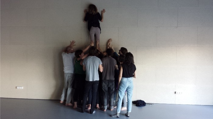 Se trabaja también con una cadena de acción conjunta, subir a hombros a una molécula del grupo y trasladarla en el espacio y luego se la traslada para encaramarla y sujetarla en alto pegada a la pared. Es bello ver a un conjunto de moléculas-cuerpos trabajando juntos para realizar una tarea física, simple y justa para el espacio y el propio grupo.